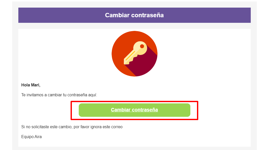 - Abre el correo y presiona la opción "Cambiar Contraseña".
