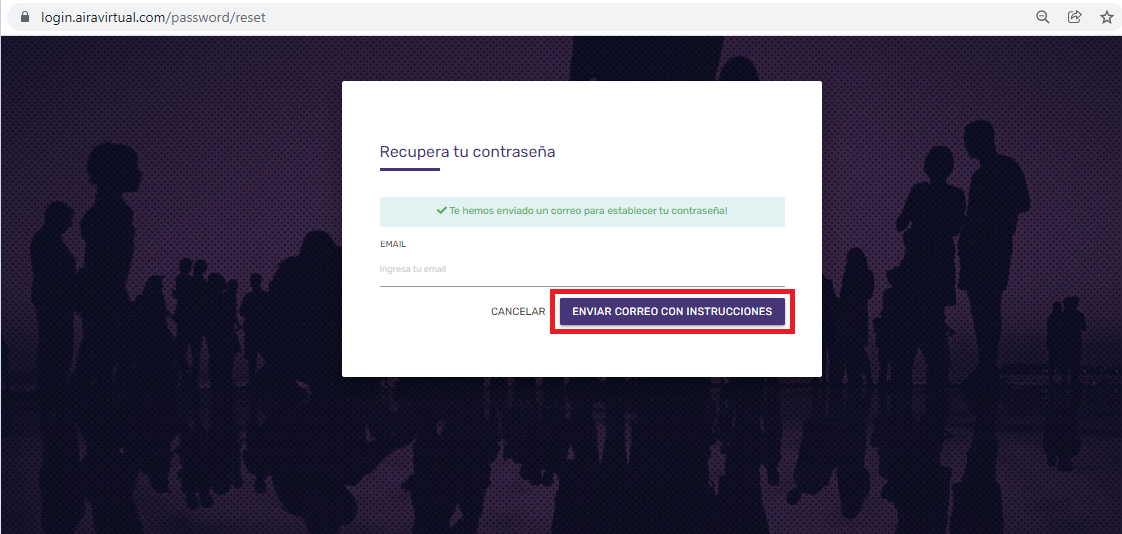 Ingresa tu dirección de correo electrónico y presiona "Enviar Correo con Instrucciones". Es importante que revises tu carpeta de correo no deseado (SPAM).