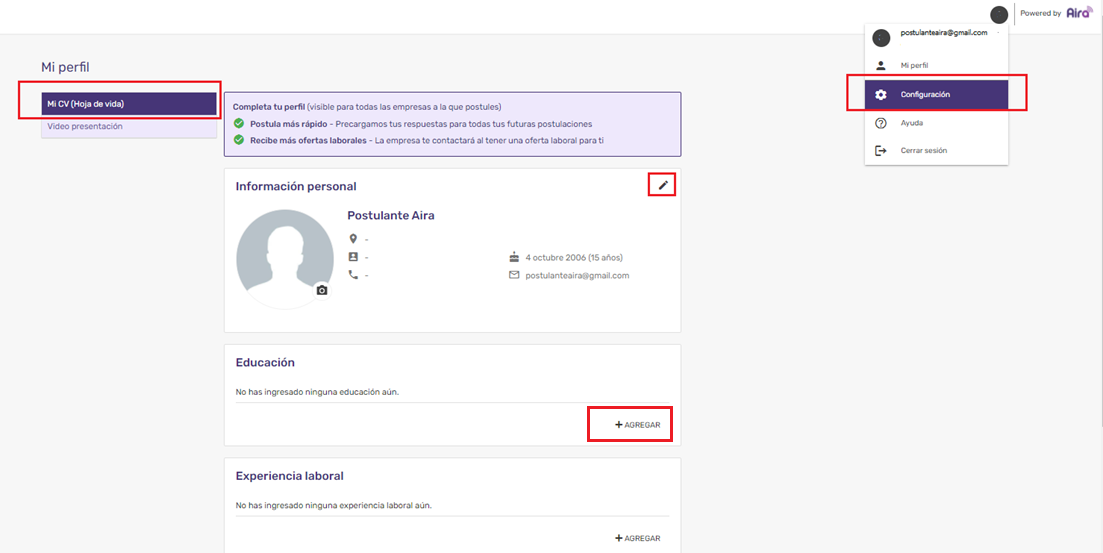 Sabemos que pudiste haber estudiado más de una carrera para potenciar tu perfil profesional. Por ello, tanto en tu perfil de postulante como en tus postulaciones puedes agregar múltiples carreras o profesiones dentro de "Mi perfil" ir a Mi CV, pestaña "Educación" y "Agregar".