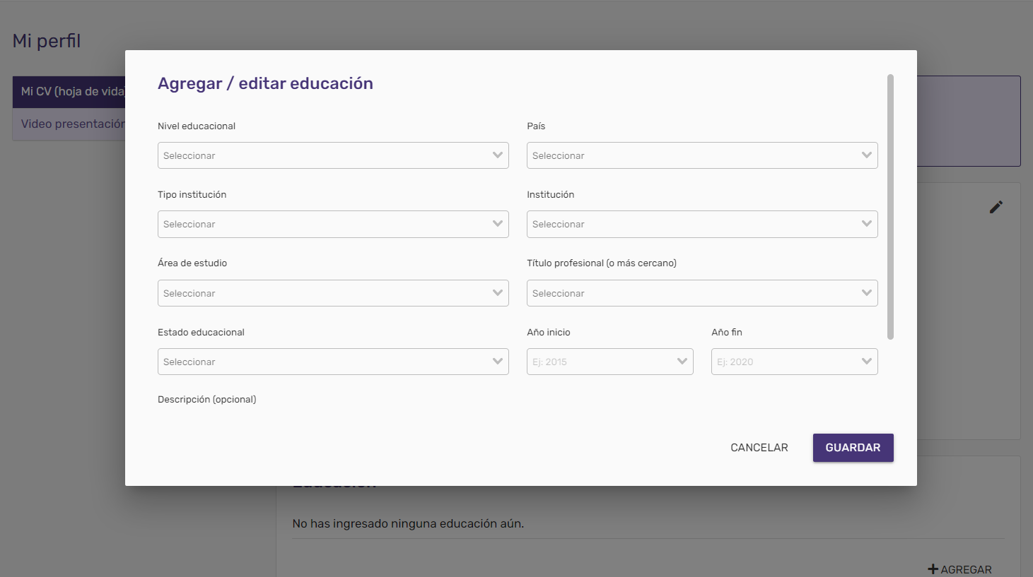 Se abrirá una ventana en la que podrás agregar todos tus conocimientos. Después de agregar los campos presiona "guardar".