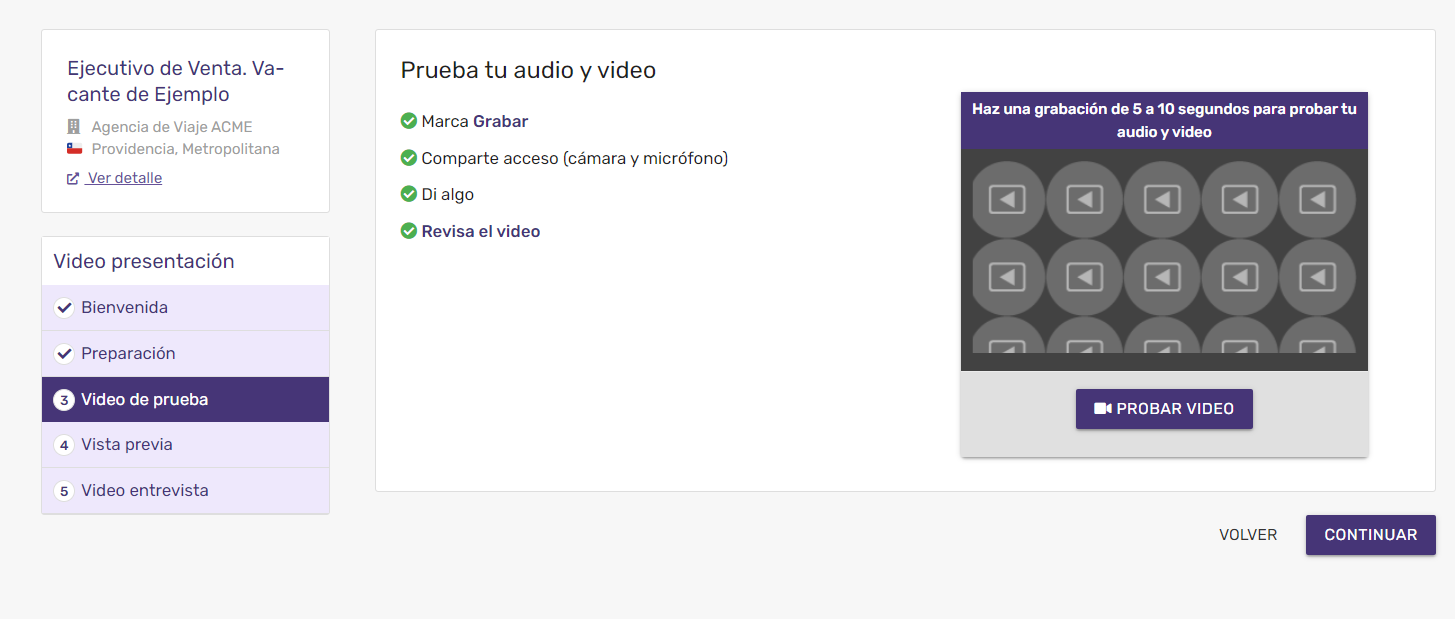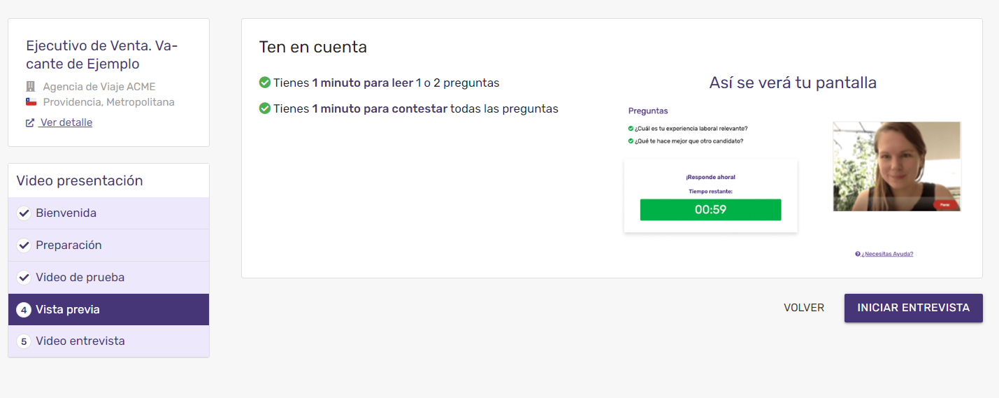 La video entrevista consiste en la grabación de un breve video, similar a una grabación de Whatsapp, en el que responderás una o dos preguntas proporcionadas por la empresa para conocer más sobre ti. El tiempo máximo para responder es de 1 minuto.