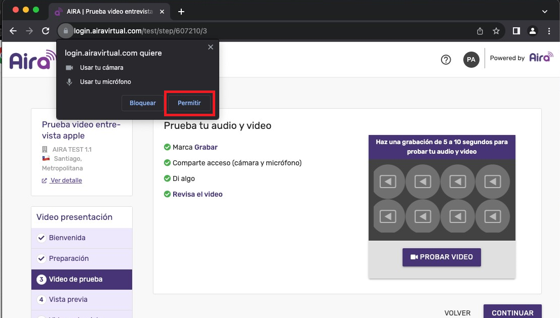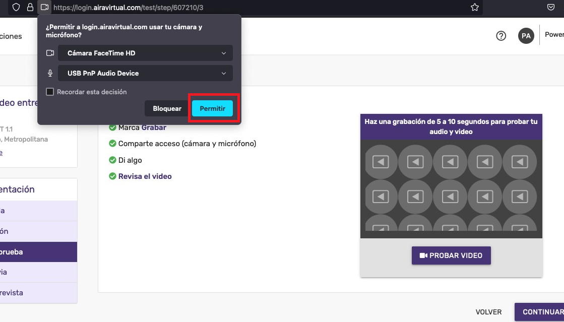 En el caso de Mac, recomendamos utilizar Google Chrome y Mozilla Firefox. Aquí debes permitir el acceso a tu cámara y micrófono también.